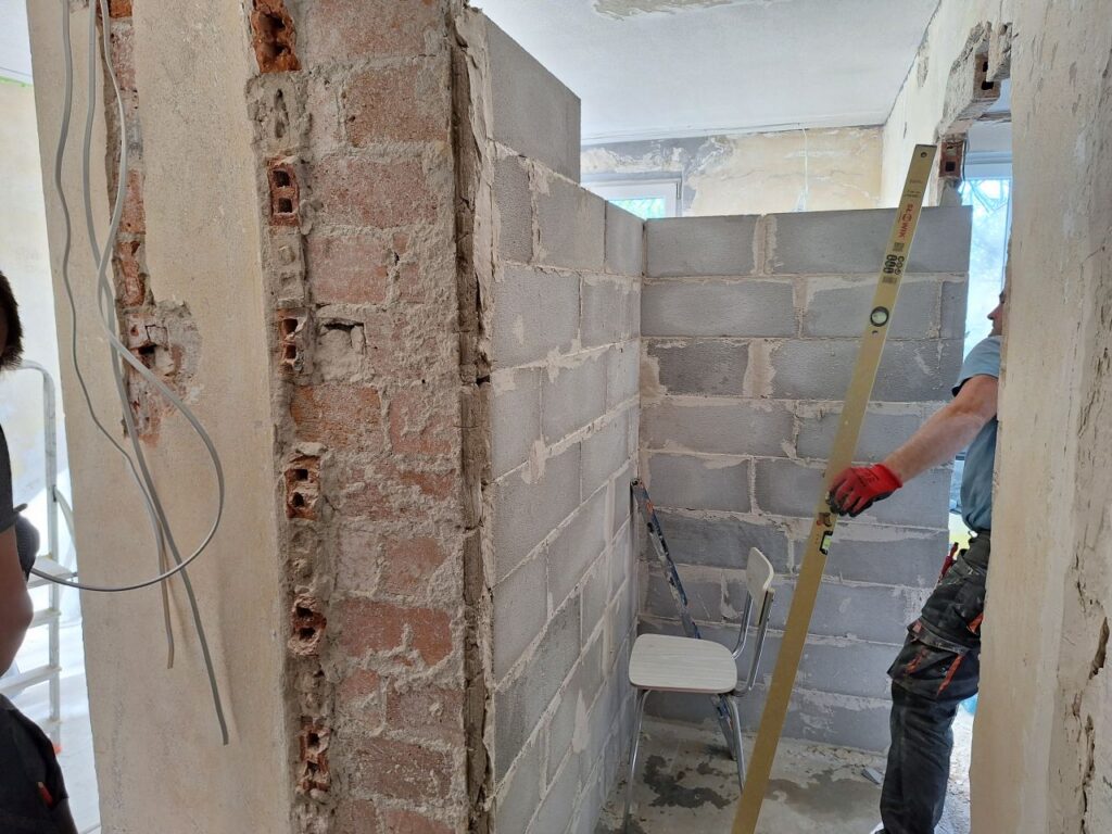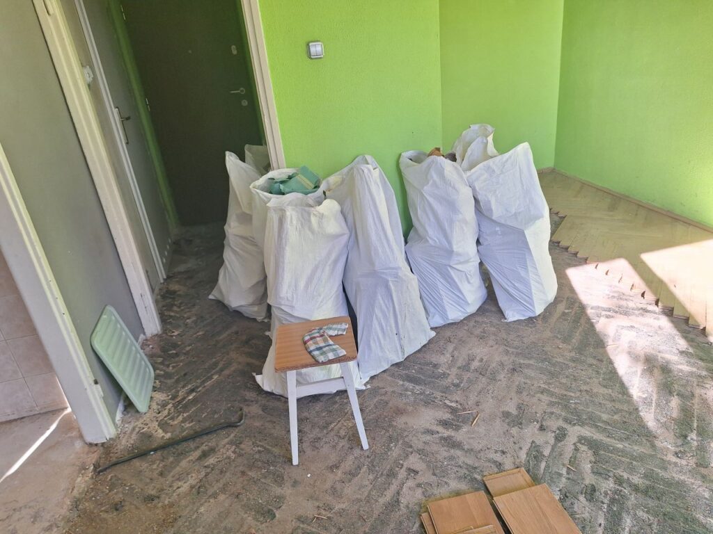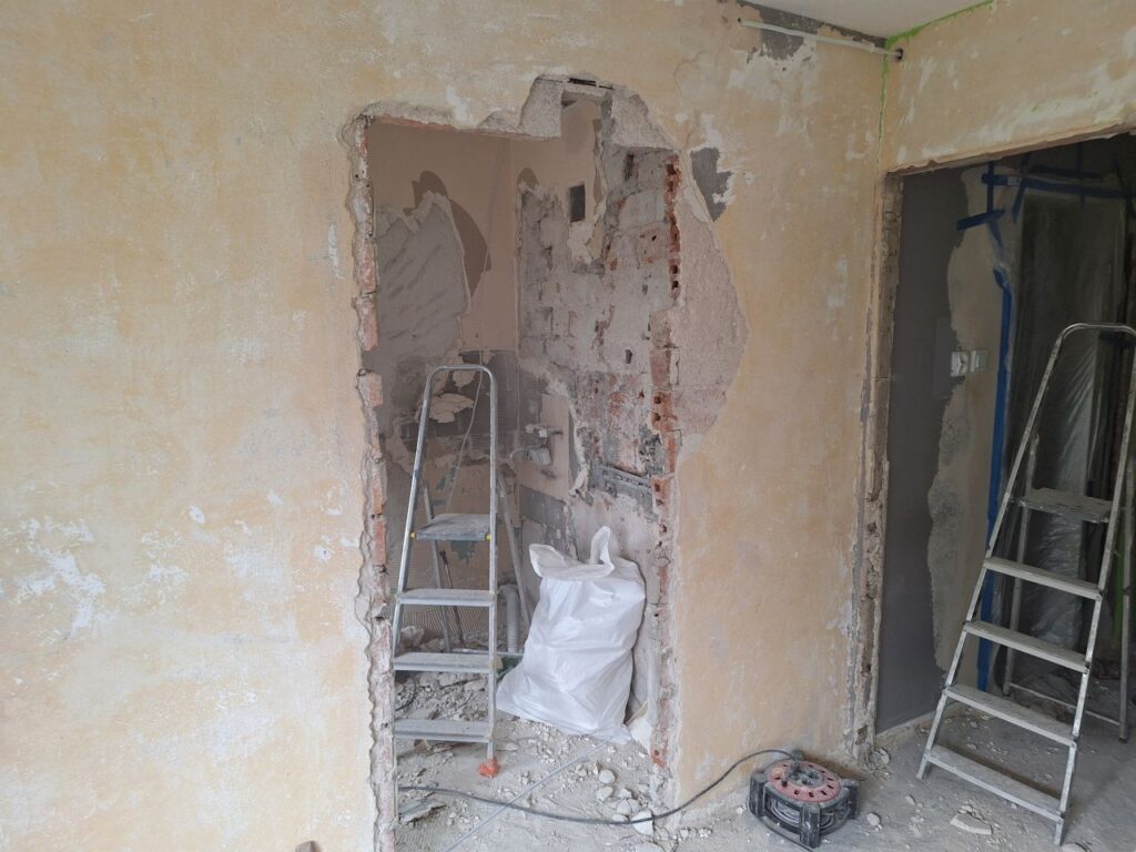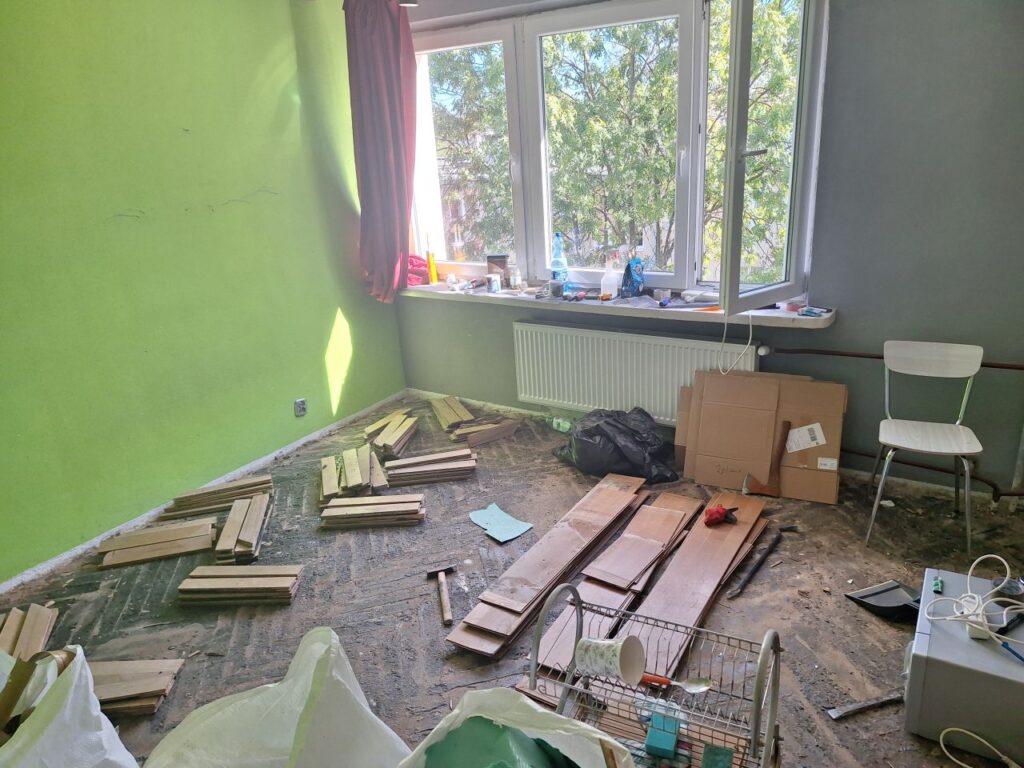 Remont od podstaw z przeniesieniem kuchni, w jej miejsce wygospodarowanie dodatkowego pokoju. Zaczeliśmy od zerwania strego parkietu łącznie z usunięciem SUBITU. Następnie usunięcie tynków, starych instalacji, wycięcie ścian …itd.