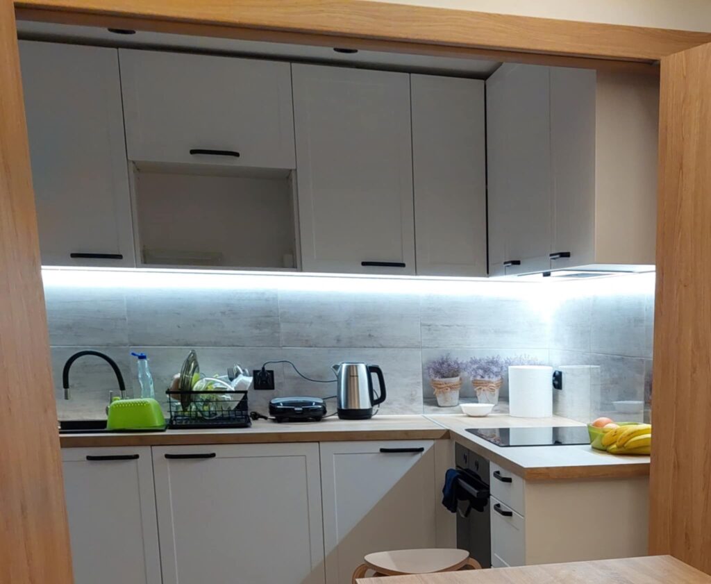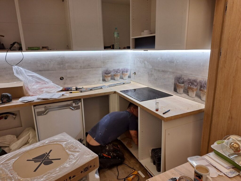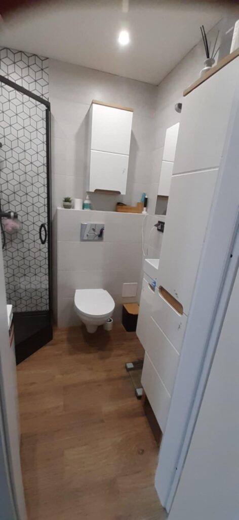 Położenie nowych instalacji (elektrycznej, hydralulicznej), budowa nowych ścianek, podłoga, ściany, płytki, sufity, drzwi (wykonany sufit podwieszany z halogeniami, w salonie sufit napinany podświetlany LED). Płytki w łażience i kuchni. Składanie i montaż mebli, sprzątanie i oddanie klientowi.